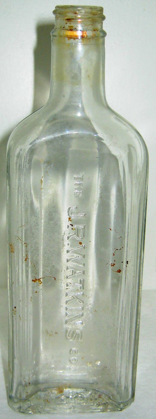 | Medicinal products seemed to be very abundant during the the early 1900's and in the bottles that we recovered, and this clear bottle is no exception. The bottle is embossed with The JR Watkins Co. in decorative script lettering, was manufactured by the Owens-Illinois Glass Company in 1937 and measures 8" tall. (03/22/12) |